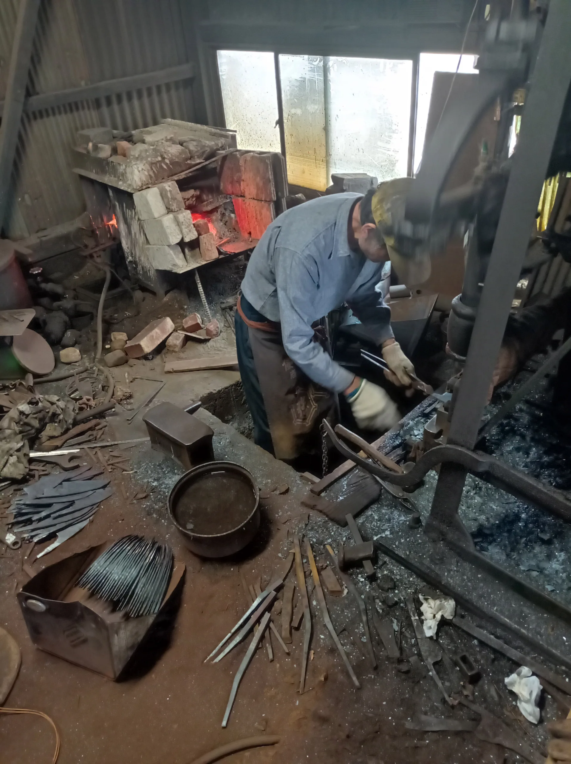 Au cœur de la forge se trouve le foyer, un grand four où la chaleur intense est produite à l’aide de charbon de bois. Le charbon japonais, particulièrement le sumibi (charbon de bambou), est utilisé pour maintenir une température constante et élevée. Le four est une pièce essentielle de la forge, car il permet de chauffer le métal jusqu’à des températures où il devient malléable et prêt à être façonné à l’obtention de lames de couteaux japonais.