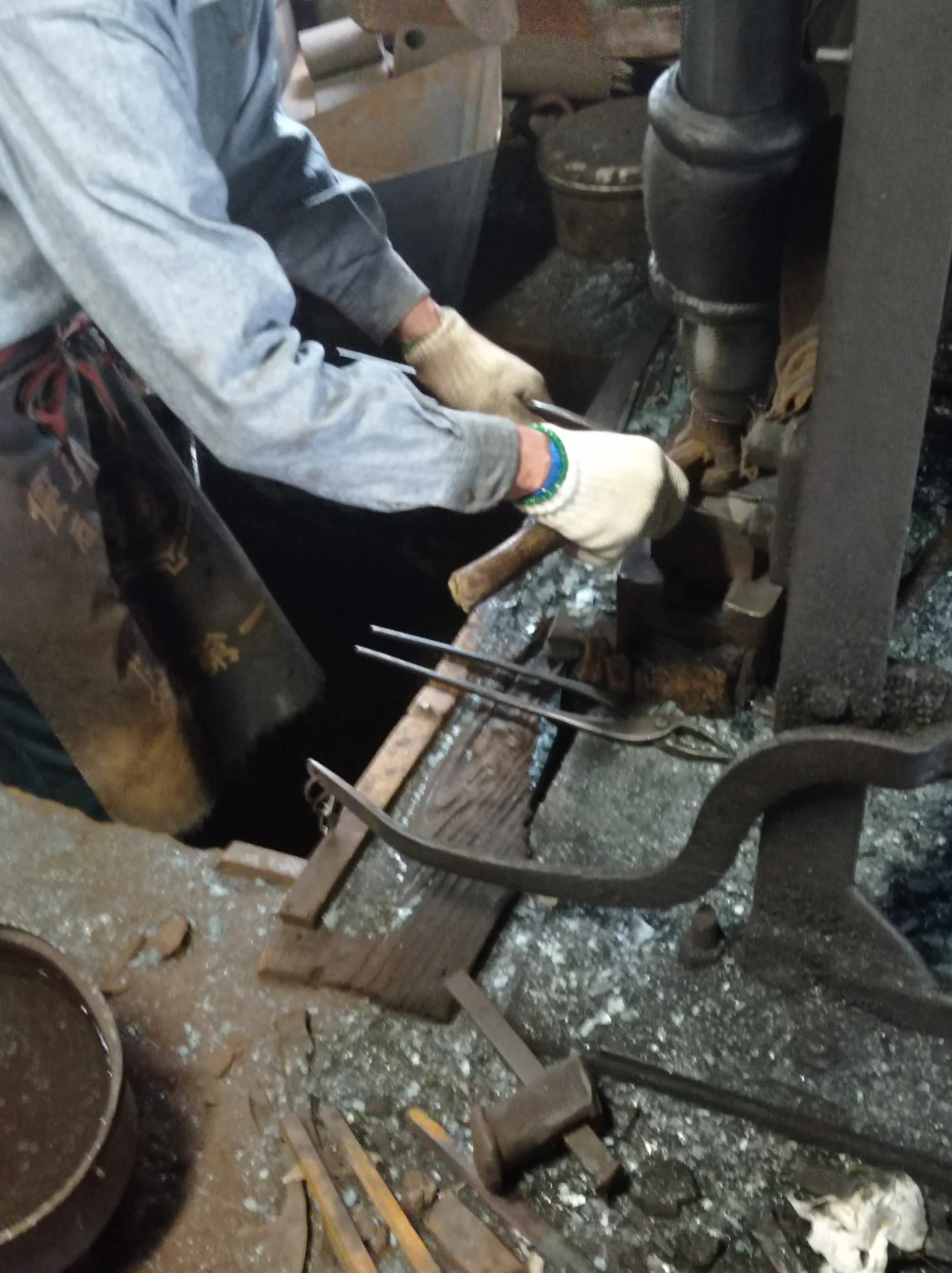 Le charbon est placé dans un four traditionnel en argile, qui est alimenté en continu pour maintenir la température nécessaire à la forge du métal. La chaleur du four atteint souvent des températures de 1 200°C à 1 400°C, ce qui est suffisant pour rendre le métal du couteau japonais flexible et prêt à être martelé. L’atmosphère dans la forge est dense et saturée de chaleur, et les forgerons doivent porter des vêtements épais pour se protéger de la chaleur intense et des projections de métal chaud.