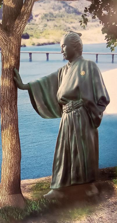 Ryoma Sakamoto est né dans la province de Tosa, de nos jours la préfecture de Kochi. De samouraï à rônin, puis politicien émérite, le Japon connut de son vivant entre 1835 et 1867 un avant et un après. C’est sur mer et sur terre qu’il s’illustra pour mener à la démission du dernier shogun. Il fonda la première société anonyme du Japon et la marine japonaise lui est redevable. Sa mémoire a traversée les âges, ses histoires contées aux jeunes Japonais. Son empreinte dans sa région natale est respectueusement entretenue.