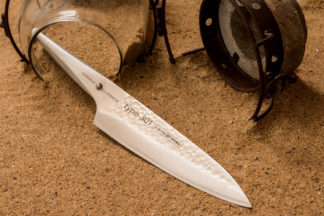Lames ambidextre aiguisées à 15° de chaque côté excepté le couteau Sashimi biseauté droitier référence P38. Aiguisage à la pierre à aiguiser de grains de #1000 pour un entretien régulier pouvant être accompagné d’une pierre plus fine comme seconde étape pour un tranchant poli-miroir. Il peut aussi être entretenu avec un fusil en céramique (grains plus fin) pour redresser le fil de la lame.