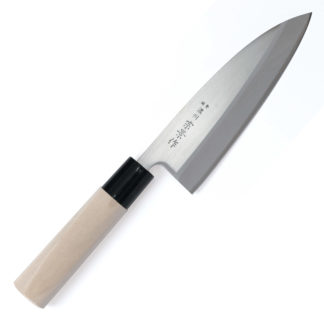 Le couteau japonais Deba est un couteau lourd et biseauté droitier servant pour la découpe de tête de poisson. Son poids permet d’être un excellent effet de balancier comme un marteau lors du tranchage de poissons.