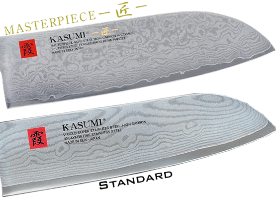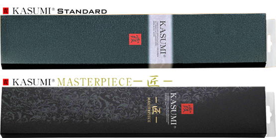 – le noyau des lames KASUMI MASTERPIECE est fait d’un acier VG10 à 1,0 % de carbone, les lames ont une dureté Rockwell de 60°, la température idéale pour conserver longtemps le tranchant et permettre un ré-affûtage aisé par ses propres moyens. Le tranchant est obtenu en aiguisant le couteau manuellement sur des pierres à eau après de multiples processus dont une finition double avec une pierre fine d’un grain de # 3000 et un polissage supplémentaire dans le cas de la gamme MASTERPIECE. Seul KASUMI MASTERPIECE bénéficie de cette technique ancestrale, comme on faisait pour les sabres de samouraï.