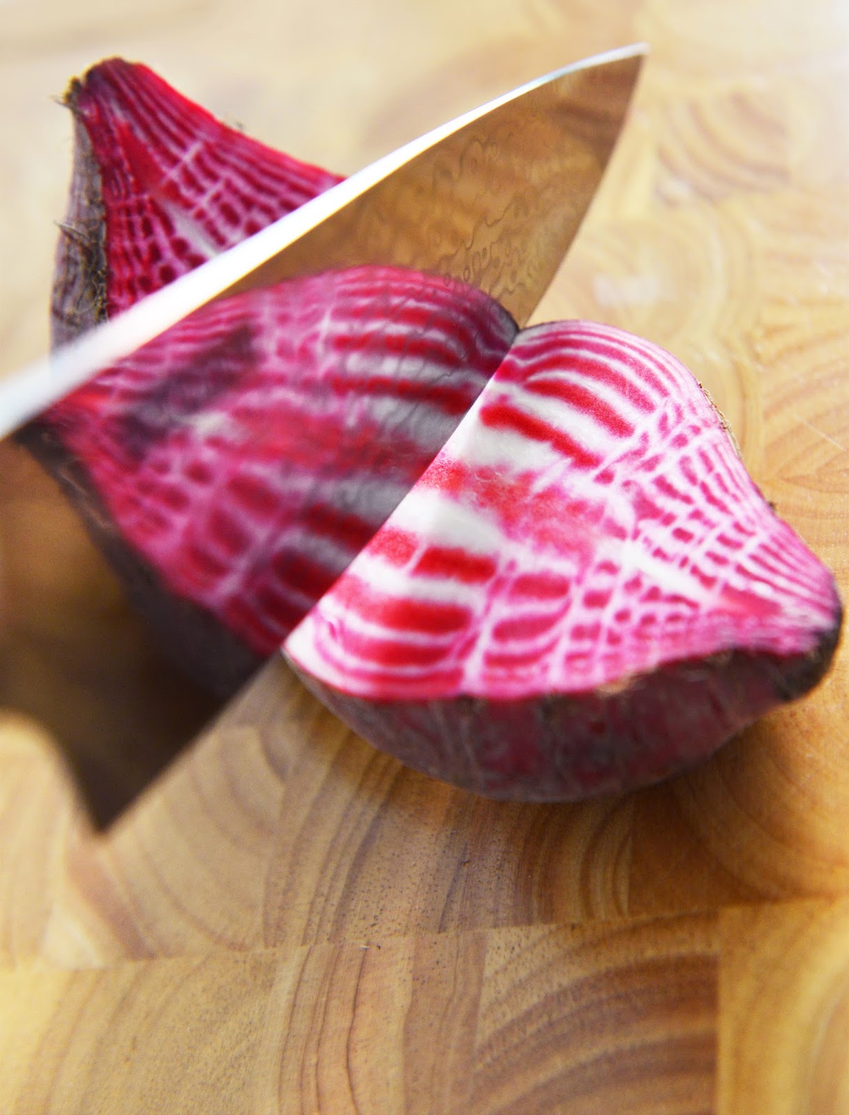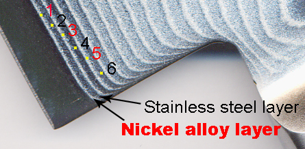A+B et C+D sont alors rattachés au noyau (VG10 chez Kasumi), 8+8+8+8 (+1) = 33 couches. On parle techniquement d’un damas impair. On peut voir les strates à l’oeil nu, l’alternance de couches d’acier étant révélée par l’application d’un acide attaquant certains alliages plus fort que d’autres et colorant ceux qui sont plus réactifs (les alliages inoxydables seront peu affectées par la solution tandis que les aciers au carbone le seront plus).