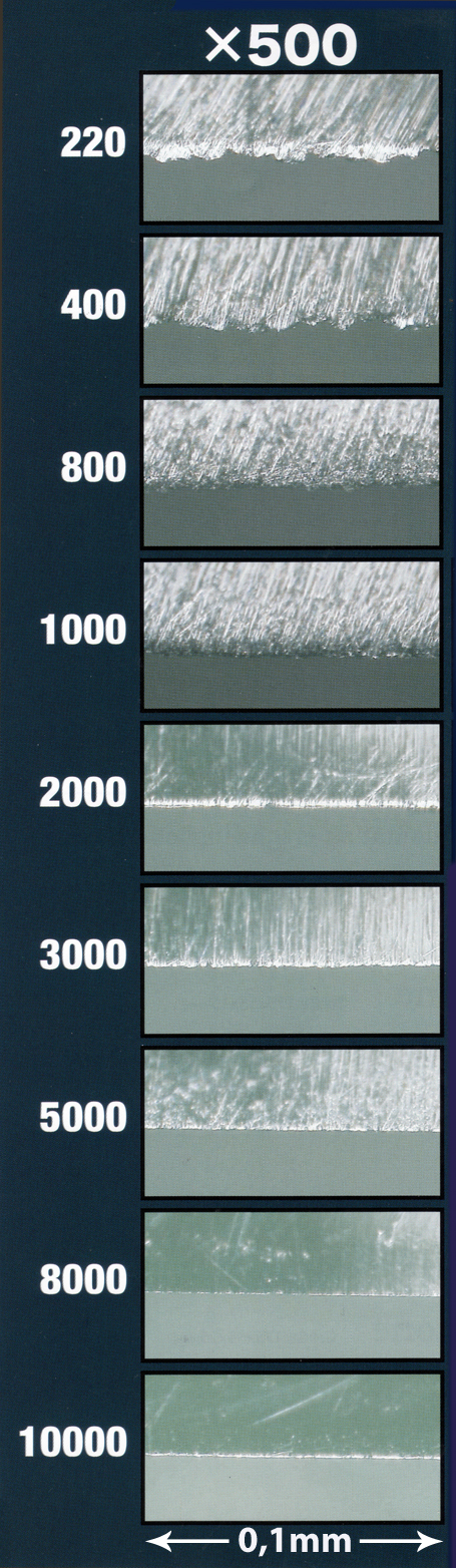 Ce que procure, lors de l’aiguisage, le passage de votre couteau sur une pierre plus fine est parfois abstrait car il n’est pas possible de voir à l’oeil nu l’impact direct sur le fil de coupe. Voici une illustration d’un fil de coupe zoomé 500x montrant à chaque étape de l’aiguisage l’évolution de l’état de celui-ci. Notez que si il n’est pas obligatoire de passer par toutes ces étapes, il n’est pas possible d’aller directement aux grains les plus fins. Il n’est pas non plus obligatoire d’utiliser le grain le plus fin pour obtenir un très bon tranchant, cela se détermine en fonction de la nature de l’acier à aiguiser (voir choix d’une pierre).