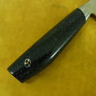 Comme matériau Kasumi a opté pour du marbre artificiel, jamais encore employé en coutellerie. Le manche ne pouvant être fabriqué en série, doit être moulé à la main, pièce par pièce. S’y ajoute le fait que la préhension a été entièrement repensée afin qu’il se cale entre ce qu’en médecine on appelle l’éminence thénar et hypothénar, en chiromancie on parlerait de mont de Vénus et mont de la Lune. Les joueurs de tennis comprendront, c’est ainsi qu’on enseigne à tenir une raquette entre pouce et auriculaire. Le manche de Kasumi VG-10 Pro a été arrondi pour se lover dans cet espace et adoucir les tensions portées sur le canal carpien. Un fabricant qui se préoccupe à ce point de la santé de ses utilisateurs c’est déjà remarquable car avouons-le, nous mêmes n’avions pas été sensibles à cet argument lors de la première présentation, pensant que le mieux serait l’ennemi du bien vu que cela allait renchérir le prix du couteau. Maintenant qu’on a le produit sous les yeux nous adhérons pleinement au message, cette quête de la perfection sans souscrire à des modes ou des contraintes économiques car un tel agrément de coupe et de prise en mains vaut son prix, et pour fêter l’évènement on invente ce terme de manche hypothénar car on aime faire évoluer le vocabulaire de la coutellerie chez Chroma France !