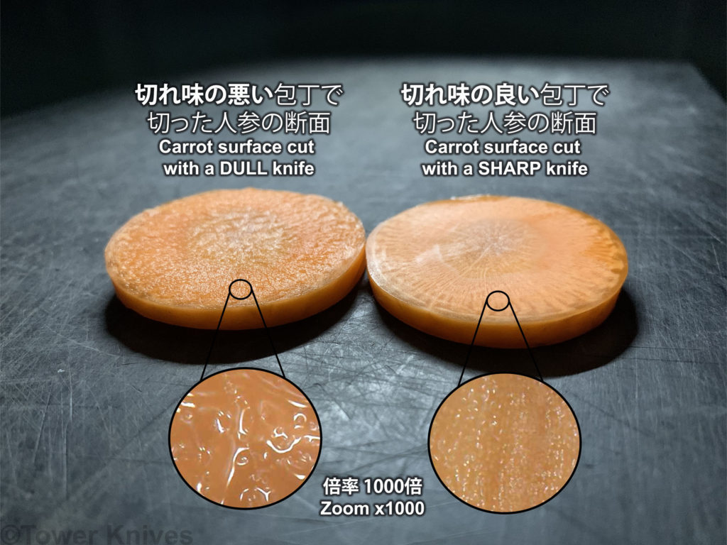 Vous avez en peu de mots l’explication pourquoi leurs couteaux sont tellement appréciés. Toute l’architecture du couteau est conçue de telle sorte que les mets conservent leurs qualités organoleptiques. C’est la forme de la lame, le profil, des astuces par ci, par là. Le but est de réduire le contact avec l’air et donc les bactéries. L’exemple avec une carotte ci-dessus expliquée par Björn Heiberg, un revendeur de couteaux japonais à Tokyo et Osaka, que nous côtoyons de longue date. « Si la surface n’est pas nette, l’aliment est plus en contact avec l’air, il est alors plus facile aux germes de pénétrer » (sic). Fujji Keiichi, créateur et superviseur des gammes Haiku Itamae de Chroma, ajoute : « Il y a très certainement de bons couteaux ailleurs, mais la plupart sont conçus pour couper les ingrédients solides comme les pommes de terre en Allemagne, ou des carottes. Mais ils ne le sont pas pour les tranches fines de légumes, radis, etc…«