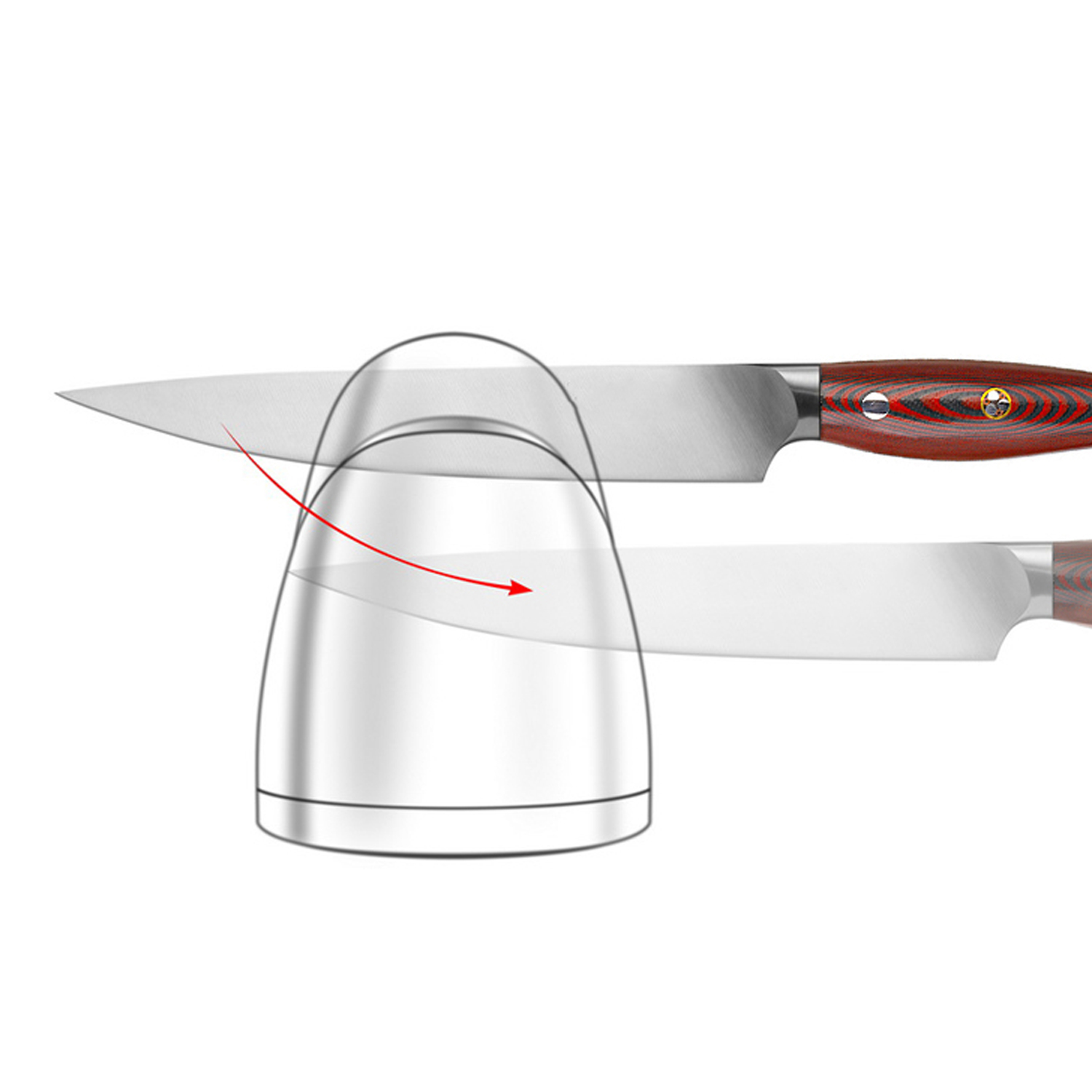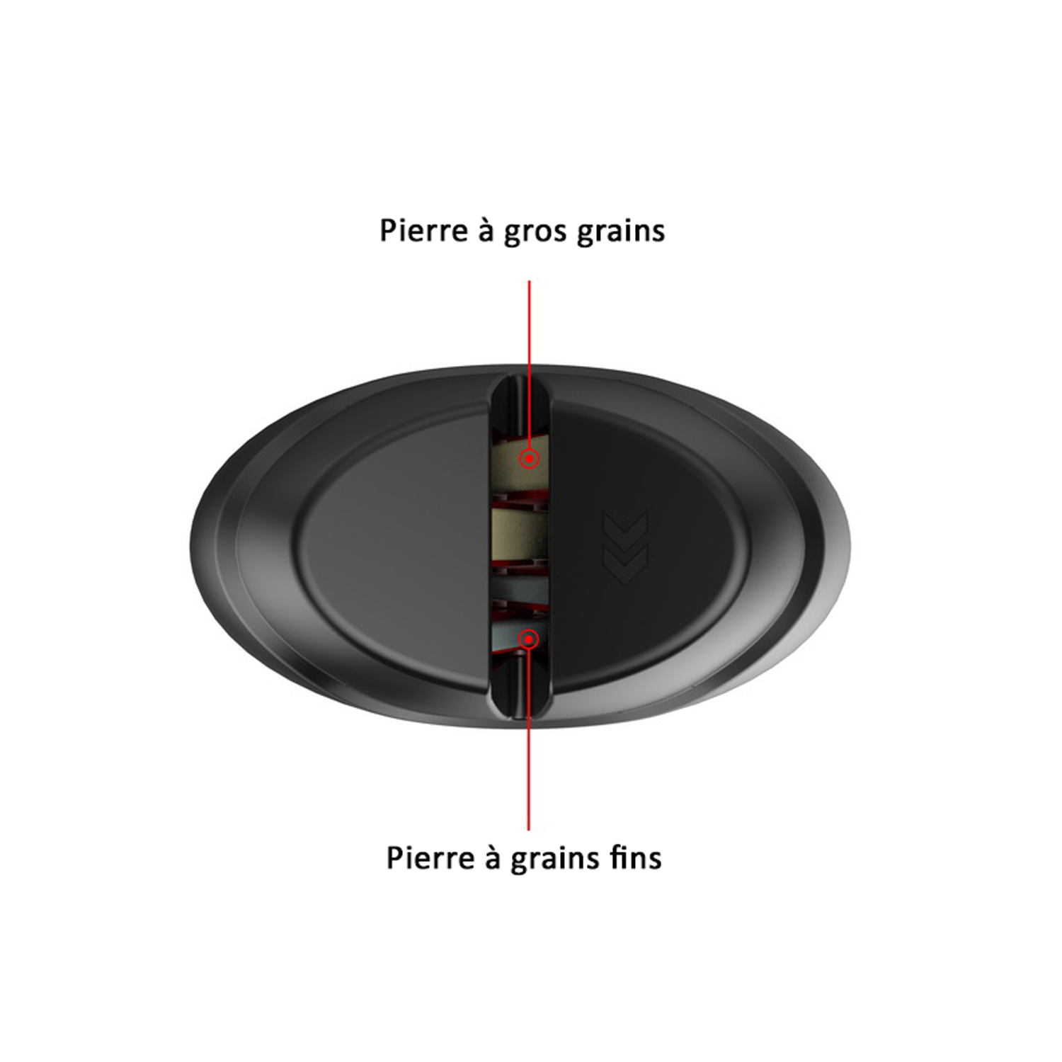 Affûteur d’appoint muni de molettes en céramique placées l’une derrière l’autre pour faire gagner du temps (et de l’argent). Chaque molette a un grain d’intensité différente. La première un grain de #220, la seconde #360. La structure de l’affûteur sur laquelle passe le couteau est élastique. De la sorte on pourra y passer autant des lames V-edge (japonaises) que des profils occidentaux (en U) c’est un des points forts de cet outil. Nous conseillons juste d’éviter les couteaux avec un degré HRC supérieur à 59° (Haiku Kurouchi ou les damas Kasumi, Takamura) ou les couteaux à angle spécial (Masahiro, Chroma Kiseki). Pour ceux-ci nous recommandons des pierres plus fines.