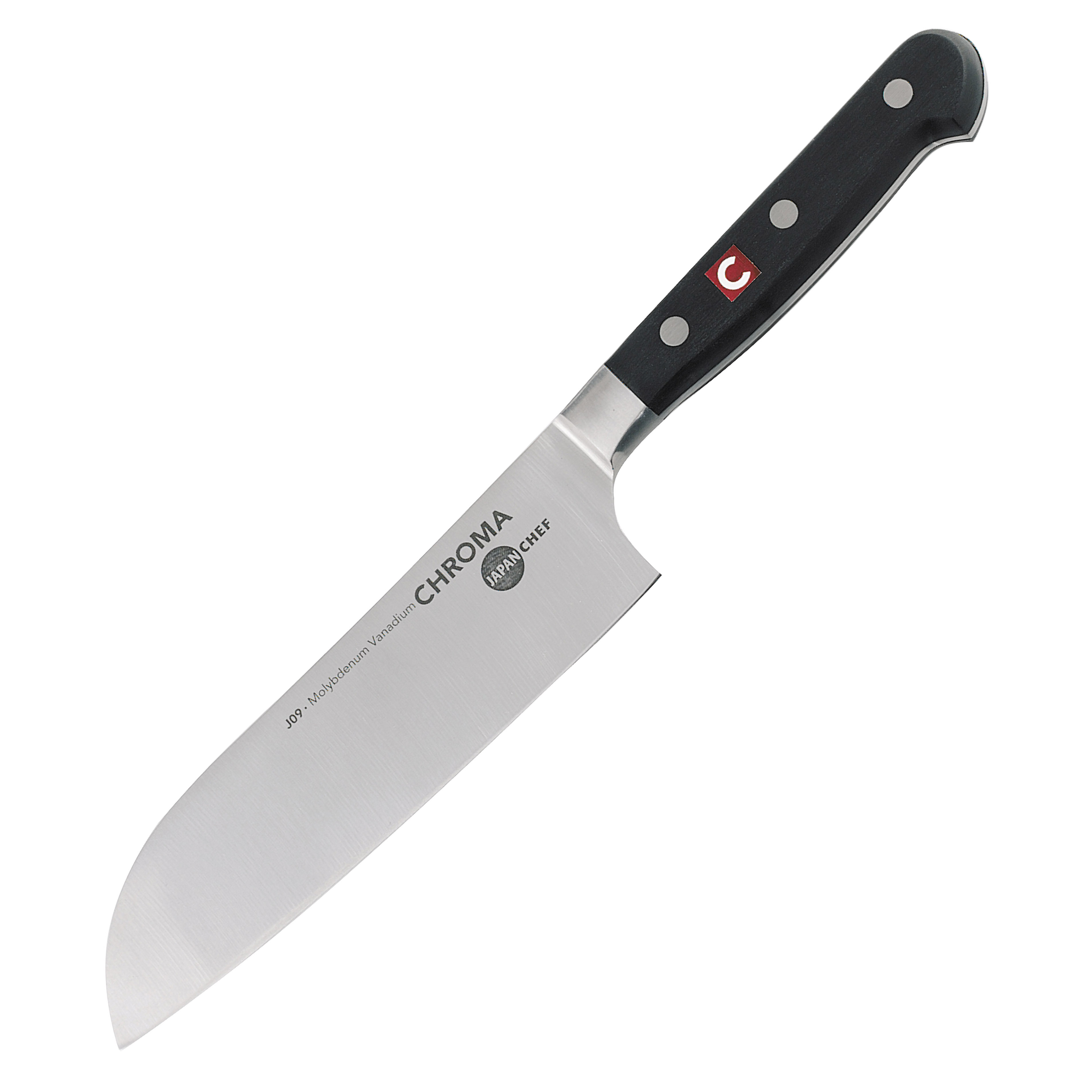 Chroma Japan Chef est en acier 0,5 % de carbone et géométrie de lame japonaise, est un condensé des meilleurs matériaux du segment moyen de gamme : acier allemand et matériau de manche origine Taïwan. Manche noir classique trois rivets avec renforts intérieurs pour plus de sûreté en cas de torsion latérales. Ce produit est assemblé en Chine. Ce qui le différencie des lames européennes c’est son émouture sous les 20° et ses formes sans talon, pouvant être affûtées dans leur intégralité.