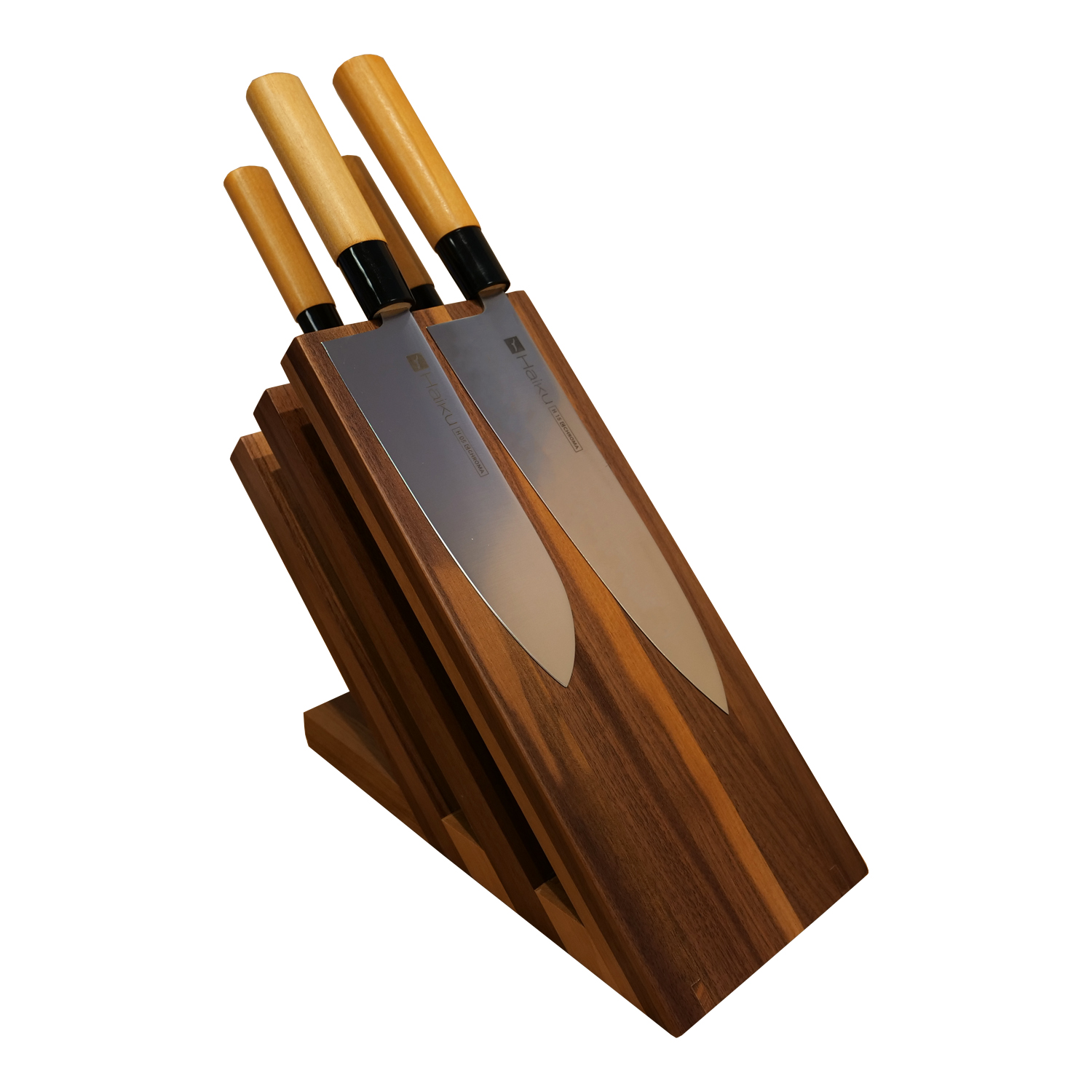 Bloc aimanté Artelegno 6 emplacements en bois de noyer équipé de 4 couteaux de la gamme Haiku Original. Ce bloc est équipé des couteaux suivants : Couteau Chef 20 cm H06 / Couteau Santoku 17 cm H05 / Couteau Universel 14 cm H03 / Couteau Office PM 10 cm H13.