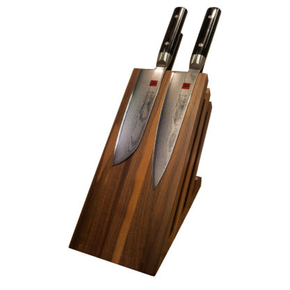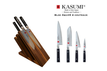 Bloc aimanté Artelegno 6 emplacements en bois de noyer équipé de 4 couteaux de la gamme Kasumi Damas. Ce bloc est équipé des couteaux suivants : Couteau Chef 20 cm / Couteau Santoku 18 cm / Couteau Honesuki 14,5 cm / Couteau Office 8 cm.
