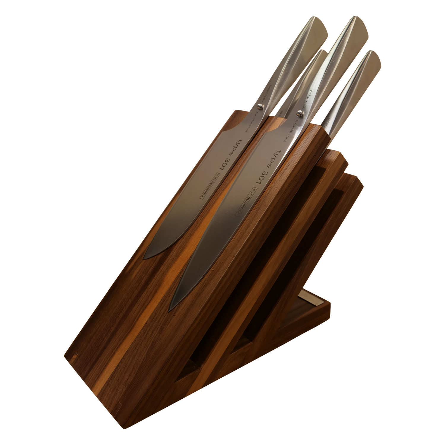 Bloc aimanté Artelegno 6 emplacements en bois de noyer équipé de 4 couteaux de la gamme CHROMA Type 301 Design by F.A. Porsche. Ce bloc est équipé des couteaux suivants : Couteau Chef 20 cm (réf. P18) / Couteau Santoku 17,8 cm (réf. P02) / Couteau à Découper 19,3 cm (réf. P05) / Couteau Office 7,7 cm (réf. P09).