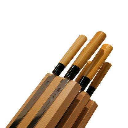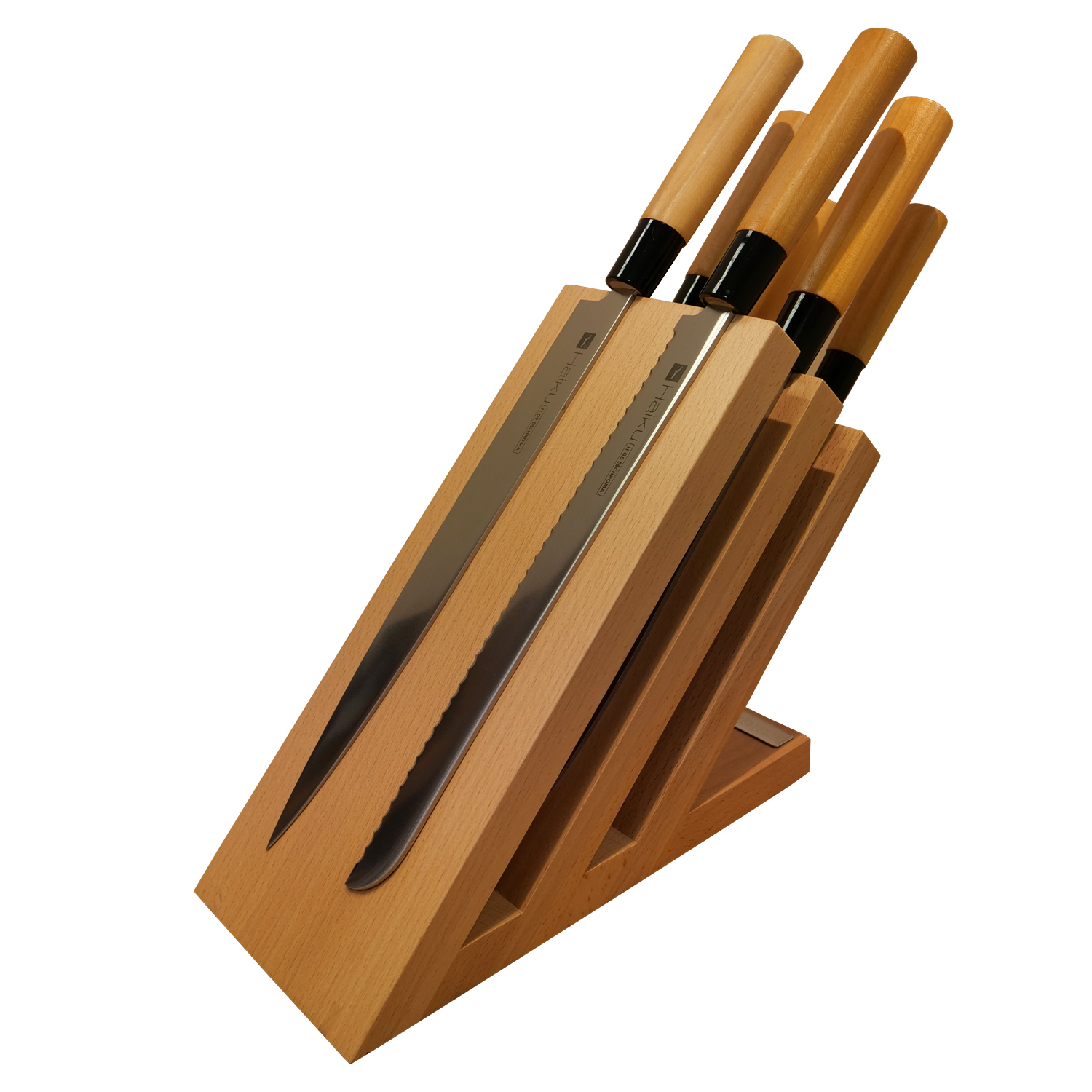 Bloc aimanté Artelegno 6 emplacements en bois de hêtre équipé de 6 couteaux de la gamme Haiku Original. Ce bloc est équipé des couteaux suivants : Couteau Chef 20 cm H06 / Couteau Santoku 17 cm H05 / Couteau Universel 14 cm H03 / Couteau Office GM 12 cm H02 / Couteau Grand Découper 26 cm H09 / Couteau à pain 25 cm H08.
