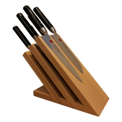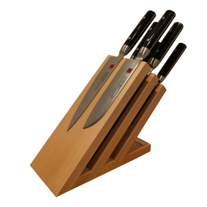 Bloc aimanté Artelegno 6 emplacements en bois de hêtre équipé de 6 couteaux de la gamme Kasumi Damas. Ce bloc est équipé des couteaux suivants : Couteau Chef 20 cm / Couteau Santoku 18 cm / Couteau Yanagiba 21 cm / Couteau Découper 24 cm / Couteau Honesuki 14,5 cm / Couteau Office 8 cm.