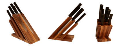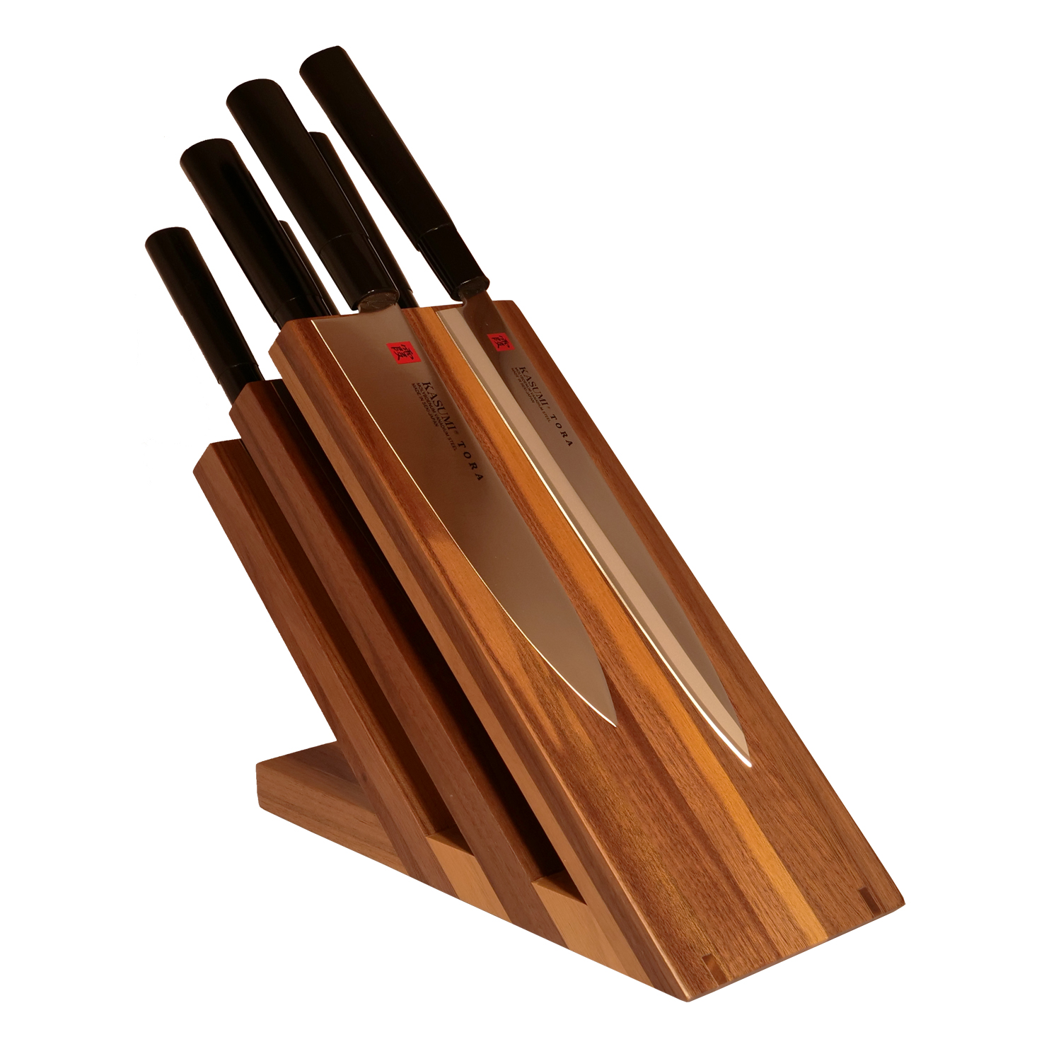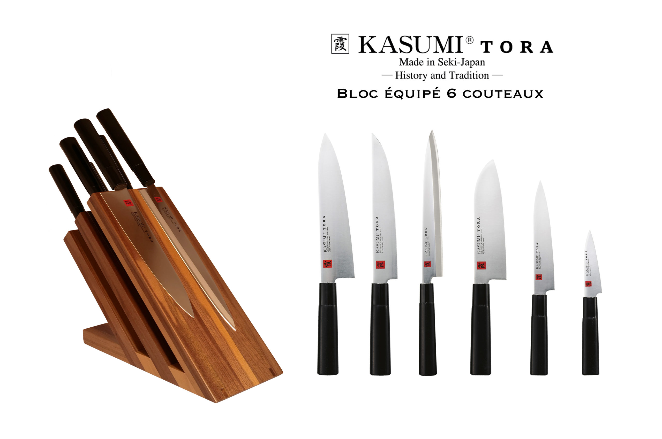Bloc aimanté Artelegno 6 emplacements en bois de noyer équipé de 6 couteaux de la gamme Kasumi Tora. Ce bloc est équipé des couteaux suivants : Couteau Chef 20 cm / Couteau Santoku 16,5 cm / Couteau à Découper 20 cm / Couteau Sashimi 24 cm / Couteau Utilitaire 15 cm / Couteau Office 9 cm.
