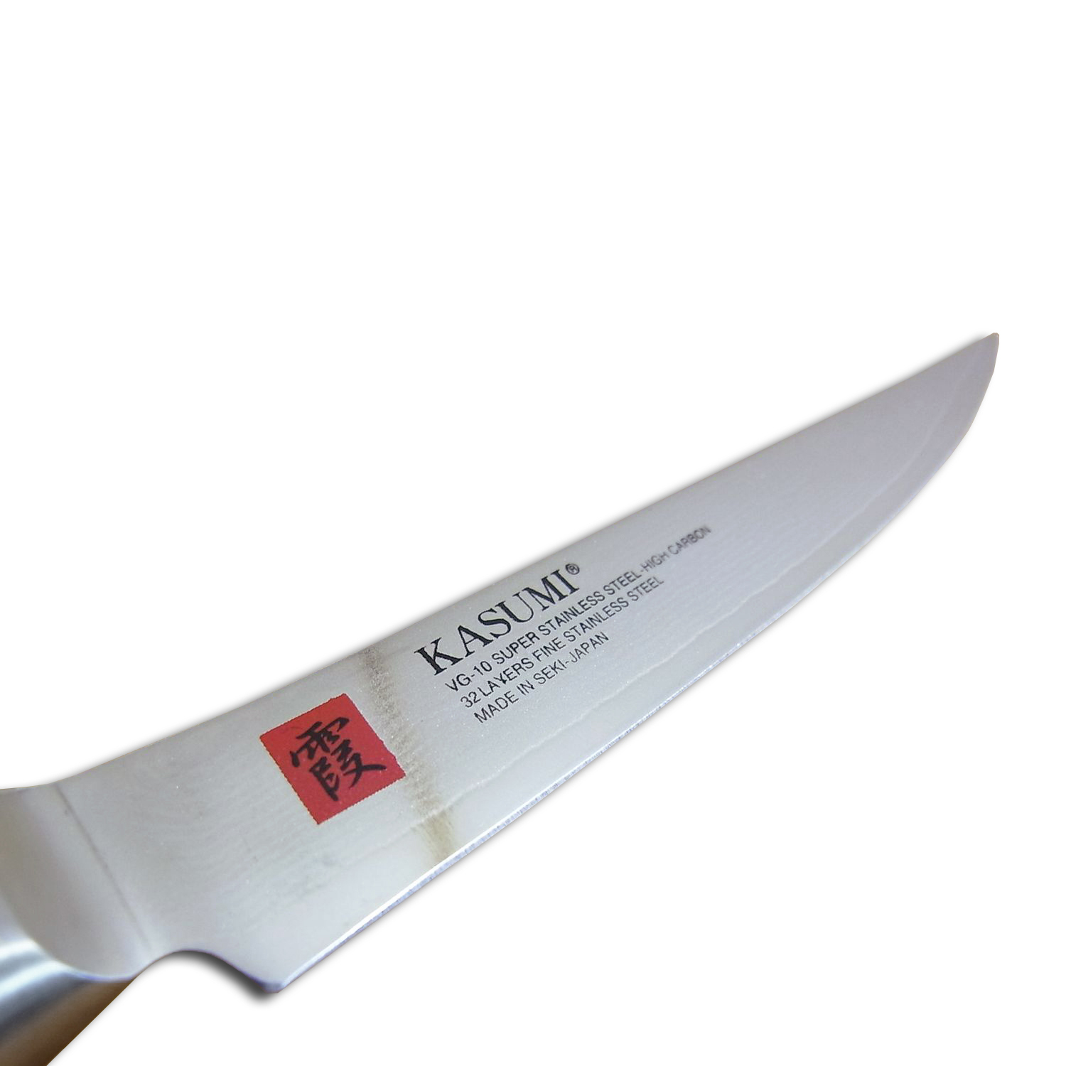 Kasumi Damas est une gamme large allant des lames les plus communes aux lames plus techniques. Cette capacité de profondeur de gamme démontre les différents savoir-faire de la marque ou ceux-ci ne s’arrêtent pas à la simplicité. Le damas est un 32 couches (32 couches paires et 32 couches impaires) fortement carburé à 1% de carbone. La mitre est traversante à deux rivets et s’accompagne d’un manche en bois de cerisier teinté noir. Des matériaux haut de gamme dont la finition est au service du cuisinier par un équilibre du couteau avant/arrière exemplaire et un tranchant redoutable dont la qualité de l’acier sur lequel il repose le destine à durer dans le temps et même s’améliorer à la suite des différents cycles d’aiguisage lors de son entretien.