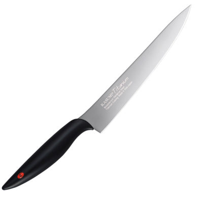 Les Japonais ont depuis quelques années adapté leurs gammes de couteaux pour répondre aux besoins des cuisines du monde. Ce couteau à découper, apparu en 2000, en est un très bon exemple. Il répondra aux besoins spécifiques de la cuisine française avec la performance d’une lame japonaise. Sa relative flexibilité pour cette longueur est aussi un avantage.