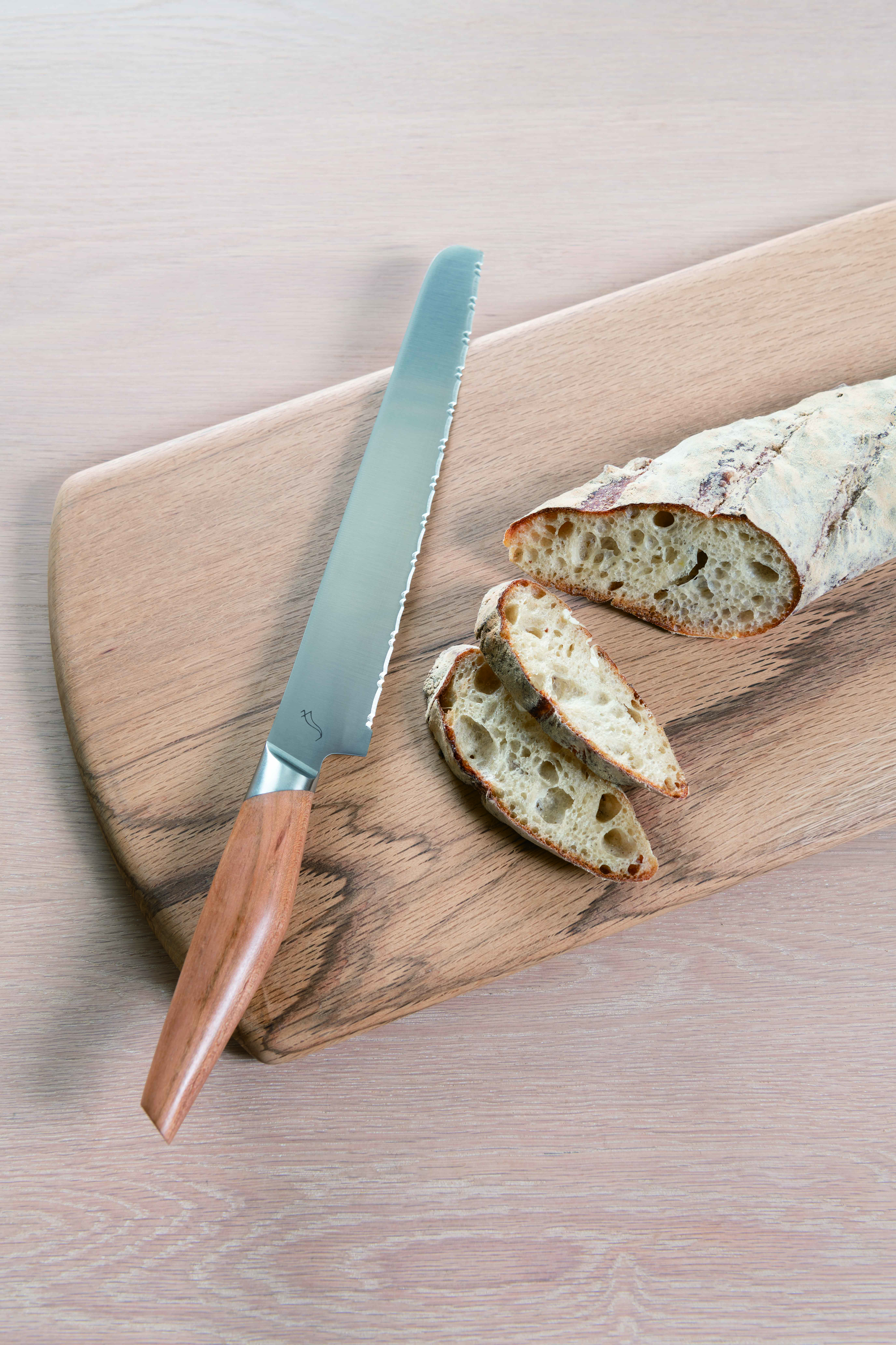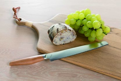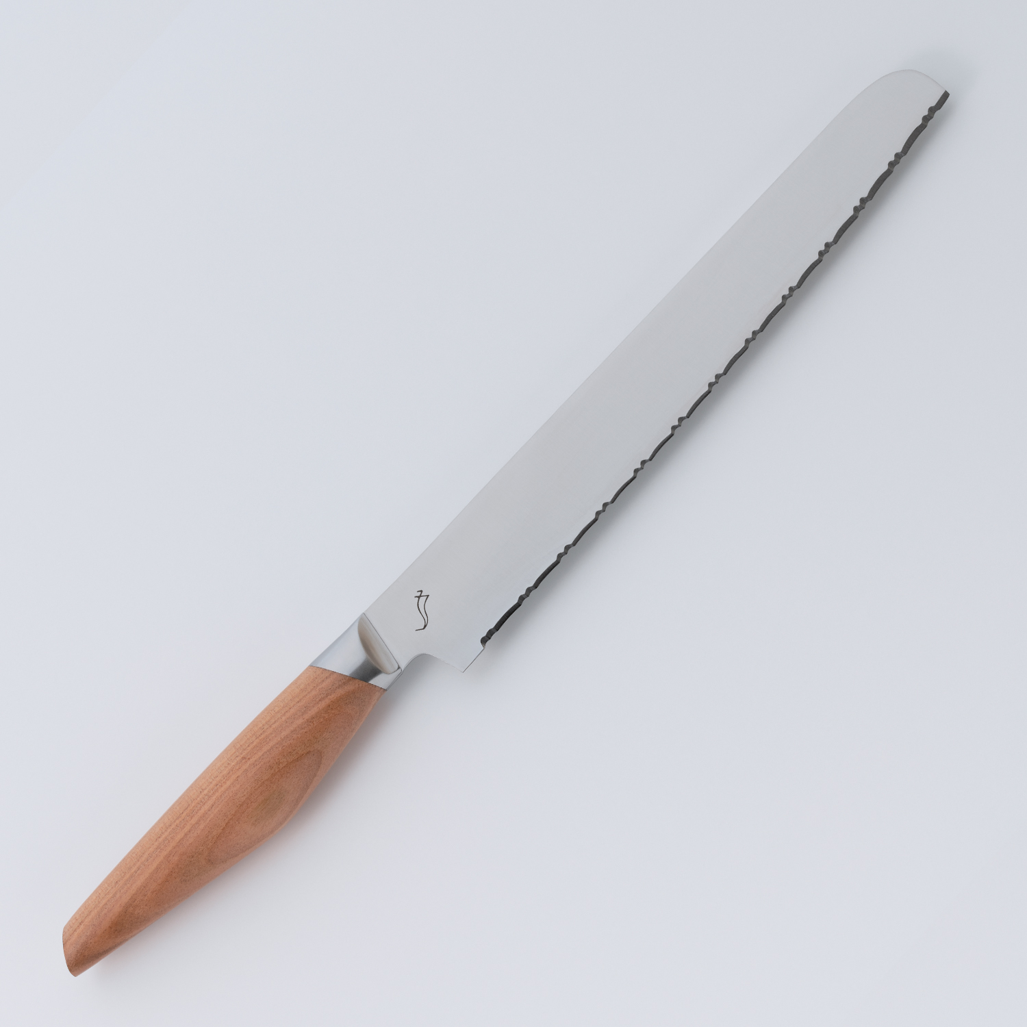 Kasumi réinvente le couteau à pain ! Couteau à pain avec dentelure alternée, mordante et soft à la fois, ne faisant pas exploser les croûtes, pour tous types de pain y compris pain de mie. Les dents sont extrêmement tranchantes mais aussi peu profondes. Alternées 2 dents pointues et courtes / 1 dent profonde et large, de la sorte moins sujettes à l’usure. Chaque dent exerce sa propre force. Il faut savoir que plus il y a de dents sur un couteau à pain, moins il coupe car si la surface dentelée est plus grande, il faut paradoxalement plus de pression et de mouvements aller/retours (un peu comme le couteau à steak non dentelé qui se guide alors qu’il faut appuyer pour le steak à dents). Un couteau à pain est aussi fait pour les rôtis ; Kasane à sa place sur les meilleures tables et cuisines