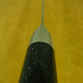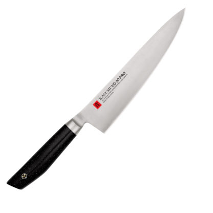 Kasumi VG10Pro comme son nom l’indique est en acier VG10. Un acier fortement carburé à 1% de carbone dont le tranchant n’a d’égal que le savoir-faire des artisans de Kasumi. Kasumi a depuis toujours travaillé le haut de gamme de la coutellerie japonaise et notamment avec des acier damas. Ici, avec Kasumi VG10Pro, l’acier est d’une seule nuance et dont le noyau en VG10 qui le compose offre un tranchant sur toute la surface de la lame. La lame s’accompagne d’un manche en marbre artificiel, une matière plus complexe est plus chère que le marbre classique. Le design du manche a demandé de nombreuses réflexions avant d’arriver au résultat d’aujourd’hui pour asseoir un confort optimal dans la main des cuisiniers par sa forme, son poids et sa longueur. Les deux derniers points, cruciaux, sont décisifs pour une bonne balance avant-arrière du couteau japonais.