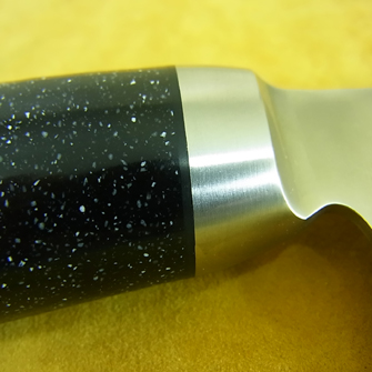 Kasumi VG10Pro comme son nom l’indique est en acier VG10. Un acier fortement carburé à 1% de carbone dont le tranchant n’a d’égal que le savoir-faire des artisans de Kasumi. Kasumi a depuis toujours travaillé le haut de gamme de la coutellerie japonaise et notamment avec des acier damas. Ici, avec Kasumi VG10Pro, l’acier est d’une seule nuance et dont le noyau en VG10 qui le compose offre un tranchant sur toute la surface de la lame. La lame s’accompagne d’un manche en marbre artificiel, une matière plus complexe est plus chère que le marbre classique. Le design du manche a demandé de nombreuses réflexions avant d’arriver au résultat d’aujourd’hui pour asseoir un confort optimal dans la main des cuisiniers par sa forme, son poids et sa longueur. Les deux derniers points, cruciaux, sont décisifs pour une bonne balance avant-arrière du couteau japonais.