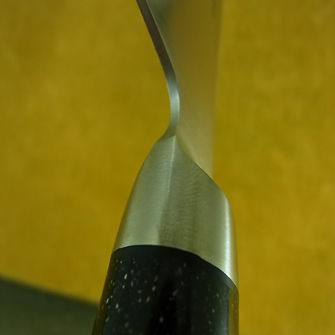 Ses années d’expérience du travail de l’acier VG10 ont été mises à profit pour développer ce couteau à fileter, dont le design rappelle furieusement les modèles suédois. Rendre flexible un acier dont la dureté avoisine les 61°HRC (+/-1) n’est pas une mince affaire. Déjà Masahiro qui a repoussé la limite du flexible au-delà des 0.7% de carbone il y a quelques années nous racontait le labeur incroyable pour y parvenir avec son acier MBS26 (0.9% de carbone, 59°HRC +/-1).