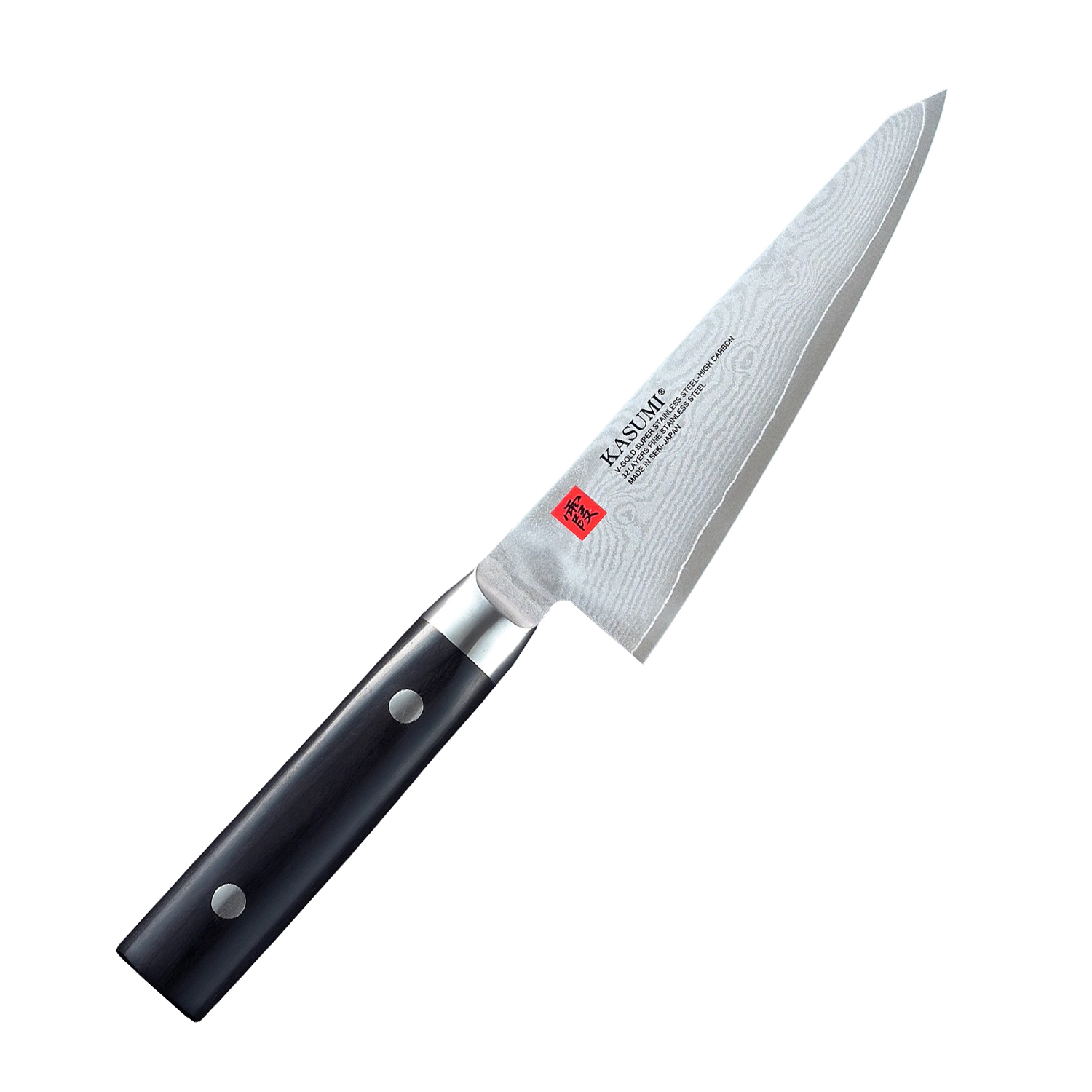 Kasumi Damas est une gamme large allant des lames les plus communes aux lames plus techniques. Cette capacité de profondeur de gamme démontre les différents savoir-faire de la marque ou ceux-ci ne s’arrêtent pas à la simplicité. Le damas est un 32 couches (32 couches paires et 32 couches impaires) fortement carburé à 1% de carbone. La mitre est traversante à deux rivets et s’accompagne d’un manche en bois de cerisier teinté noir. Des matériaux haut de gamme dont la finition est au service du cuisinier par un équilibre du couteau avant/arrière exemplaire et un tranchant redoutable dont la qualité de l’acier sur lequel il repose le destine à durer dans le temps et même s’améliorer à la suite des différents cycles d’aiguisage lors de son entretien.