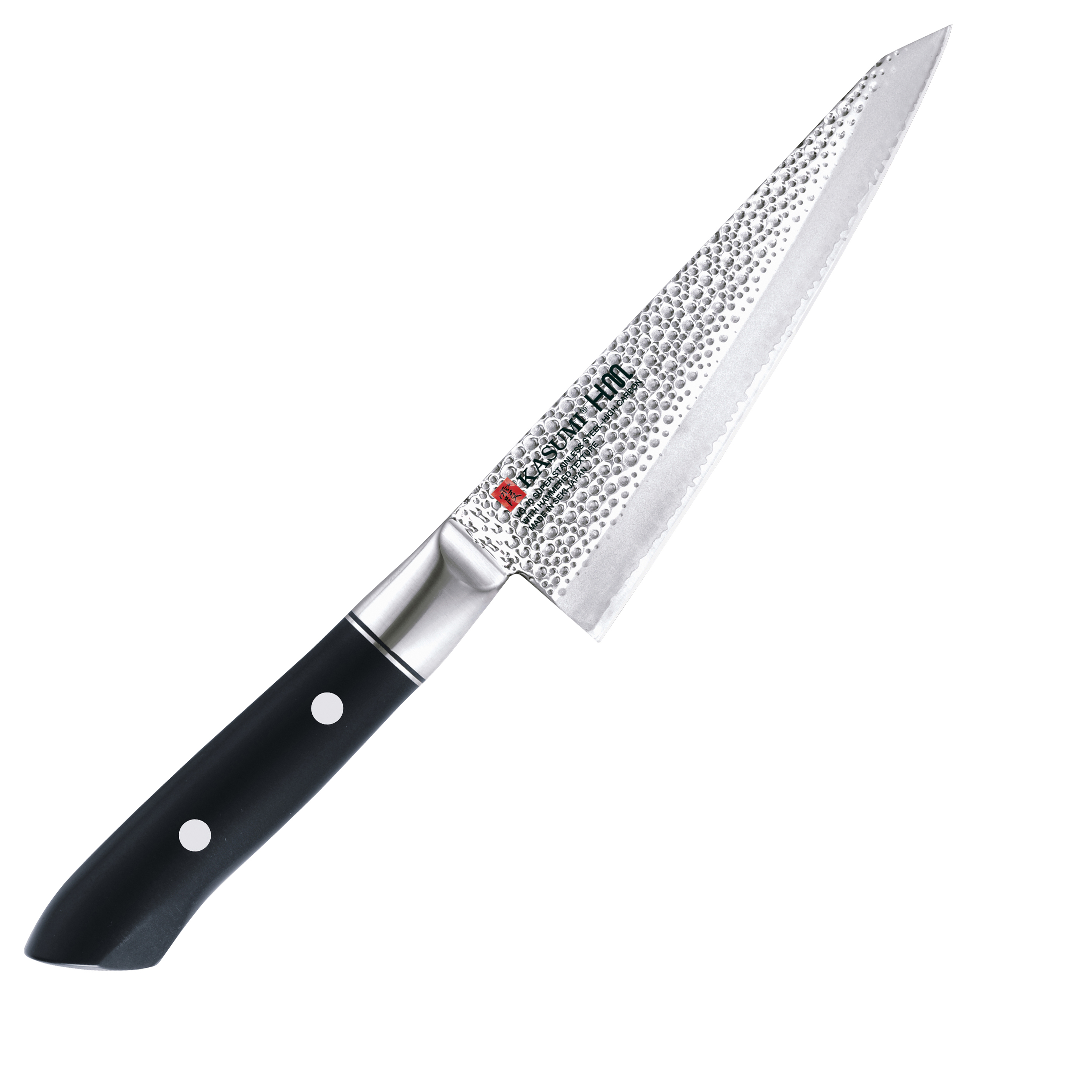 Kasumi HM est dans la lignée des séries haut de gamme de Kasumi. L’acier est en VG10 fortement carburé à 1% de carbone comme les versions damas nommées Kasumi Damas et Kasumi Masterpiece. La gamme de couteaux japonais se présente sous autre technique, celle du martelage, dont le design épuré est unique au monde. Ici encore, dans l’apparition de lames martelées sur le marché, Kasumi est précurseur. Le martelage est plus efficace que les alvéoles dont le but est de décoller les aliments plus facilement car le martelage est sur toute la surface de la lame là où les alvéoles classiques ne sont pas sur toute la hauteur de lame. La martelage s’accompagne d’un damas trois couches d’une extrême beauté. Très harmonieuse liseret en damas qui parcours le fil de la lame est appelé « hamon ». C’est un visuel que l’on retrouve sur les sabres de samouraïs auxquels la gamme rend hommage et qui met à l’honneur la technicité des artisans de Kasumi. La lame s’accompagne d’une mitre deux rivet associée d’un manche en résine dur. Sa forme permet aux grandes mains un meilleur confort grâce à sa butée arrière. Sa légèreté permet de contrebalancer le poids de la lame qui l’est également et permet une balance avant arrière parfaite.