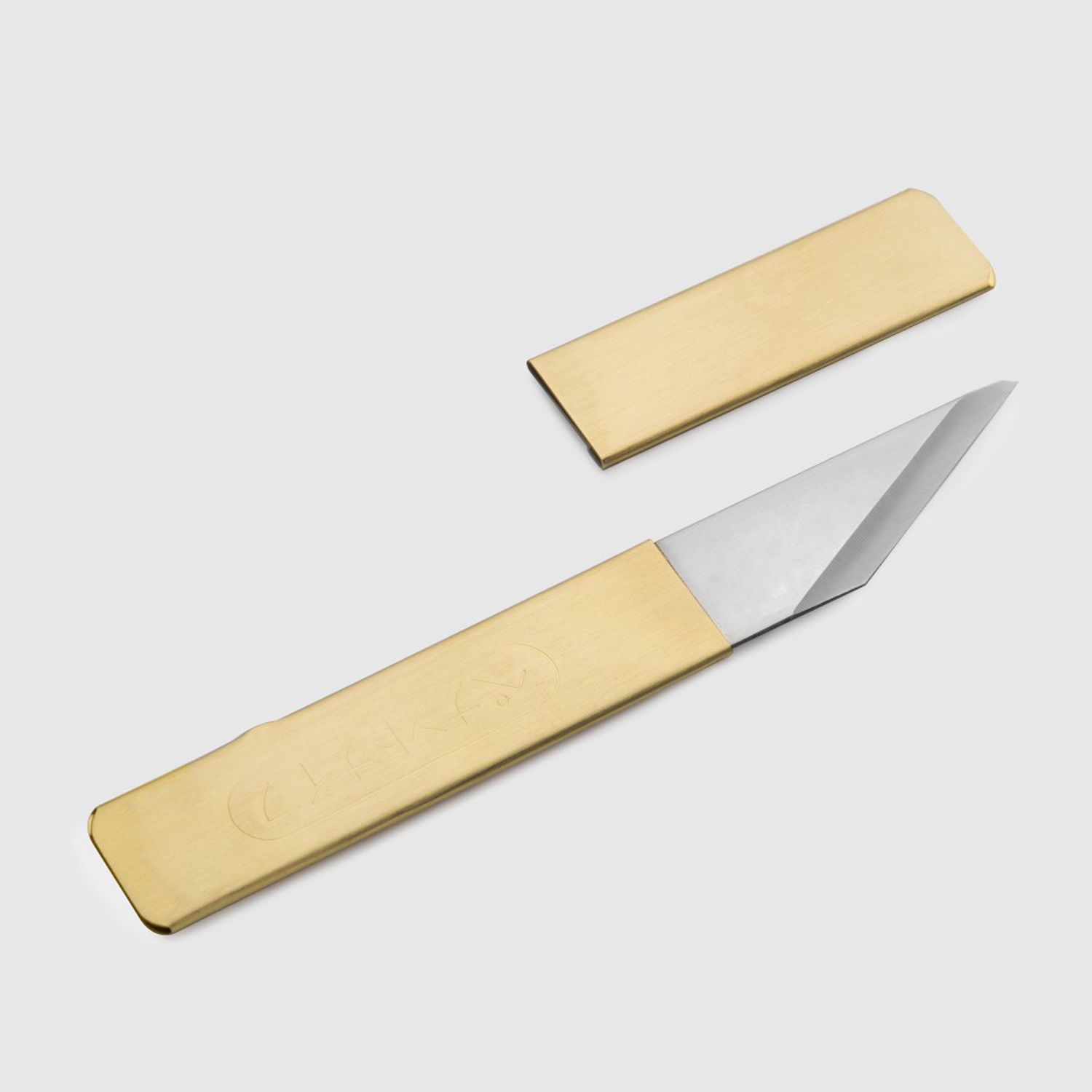 Couteau japonais Kiridashi de poche (120mm, tranchant 36mm) manche en laiton pour tous travaux de précision et de finition. Utilisé dans le scrapbooking ou la papeterie créative, il sert aussi dans la sculpture sur légumes ou pour la pâtisserie (découpe de pâte à sucre, pâte d’amande).