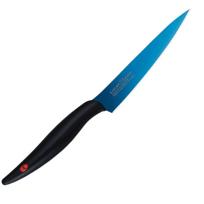 Kasumi Titanium est le poids plume des gammes de couteaux japonais du célèbre coutelier. Tout y est accentué à commencer par sa lame fine et fortement carburé recouverte de nitrure de titane. Tandis que du bois, même léger, aurait déséquilibré le couteau japonais Kasumi Titanium, la légèreté de la lame a nécessité de choisir un manche plastique pour contrebalancer à la perfection l’avant et l’arrière du couteau. Kasumi a fait le design de son manche de façon concave pour lui apporter un design futuriste mais dont la conception permet aussi au manche de tenir confortablement en main et même de façon instinctive. Les lames apportent un effet visuel saisissant qu’elles soient gris anthracite ou bleu titane et vont également permettre aux aliments de se décomposer moins vite faisant de la gamme le parfait allié des cuisiniers souhaitant un couteau pour la pâtisserie et les desserts. En effet, pour imager, lors de la découper d’une pomme, celle-ci va brunir beaucoup moins vite car elle n’aura pas été au contact de l’acier, uniquement sur le fil de la lame. Une affaire de goût aussi pour les papilles les plus développées !
