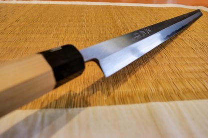 Lame de 66 cm avec un acier Shirogami I (White Paper Steel) forgé pour atteindre une dureté d’environ 64° Rockwell.