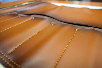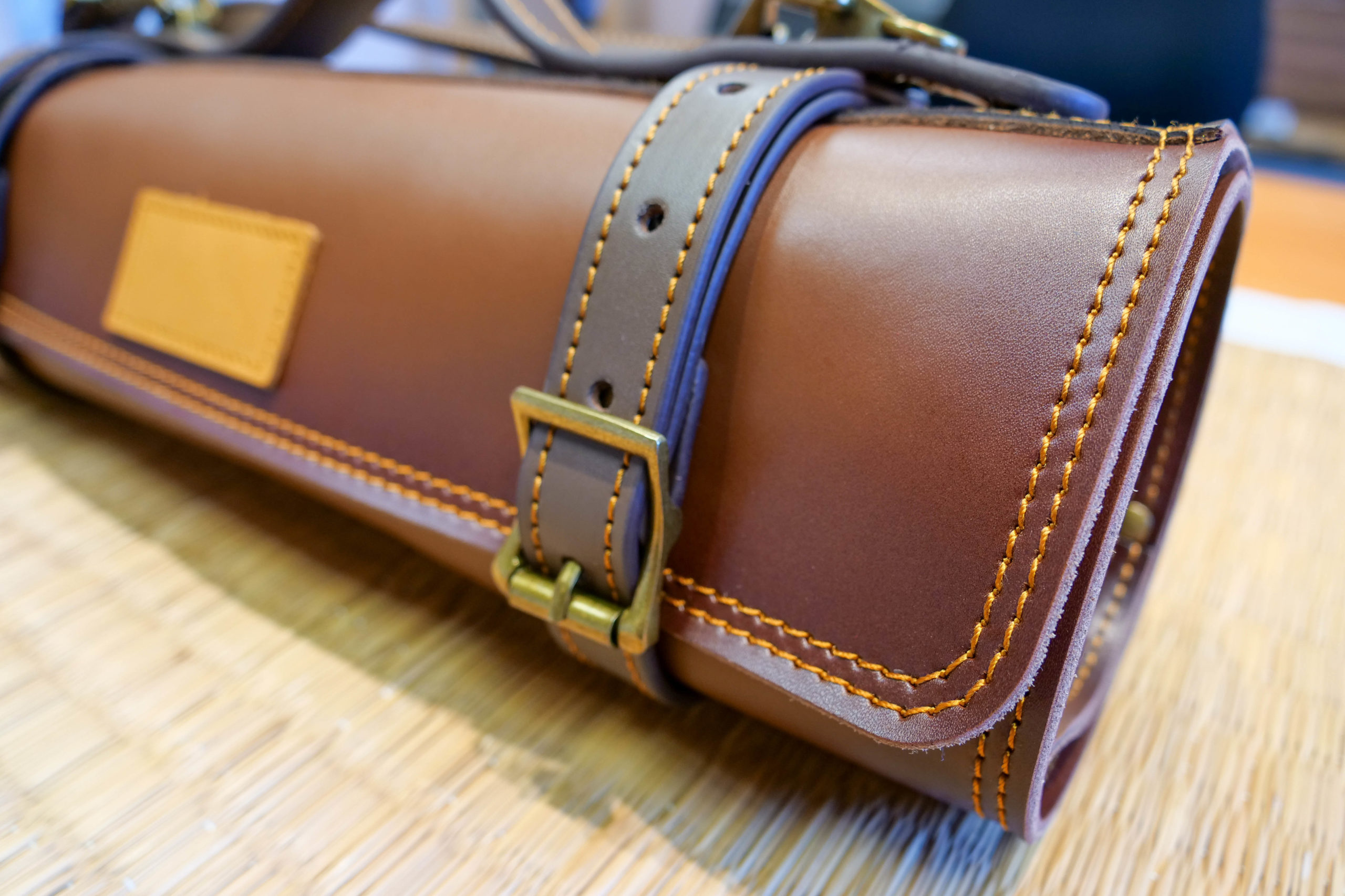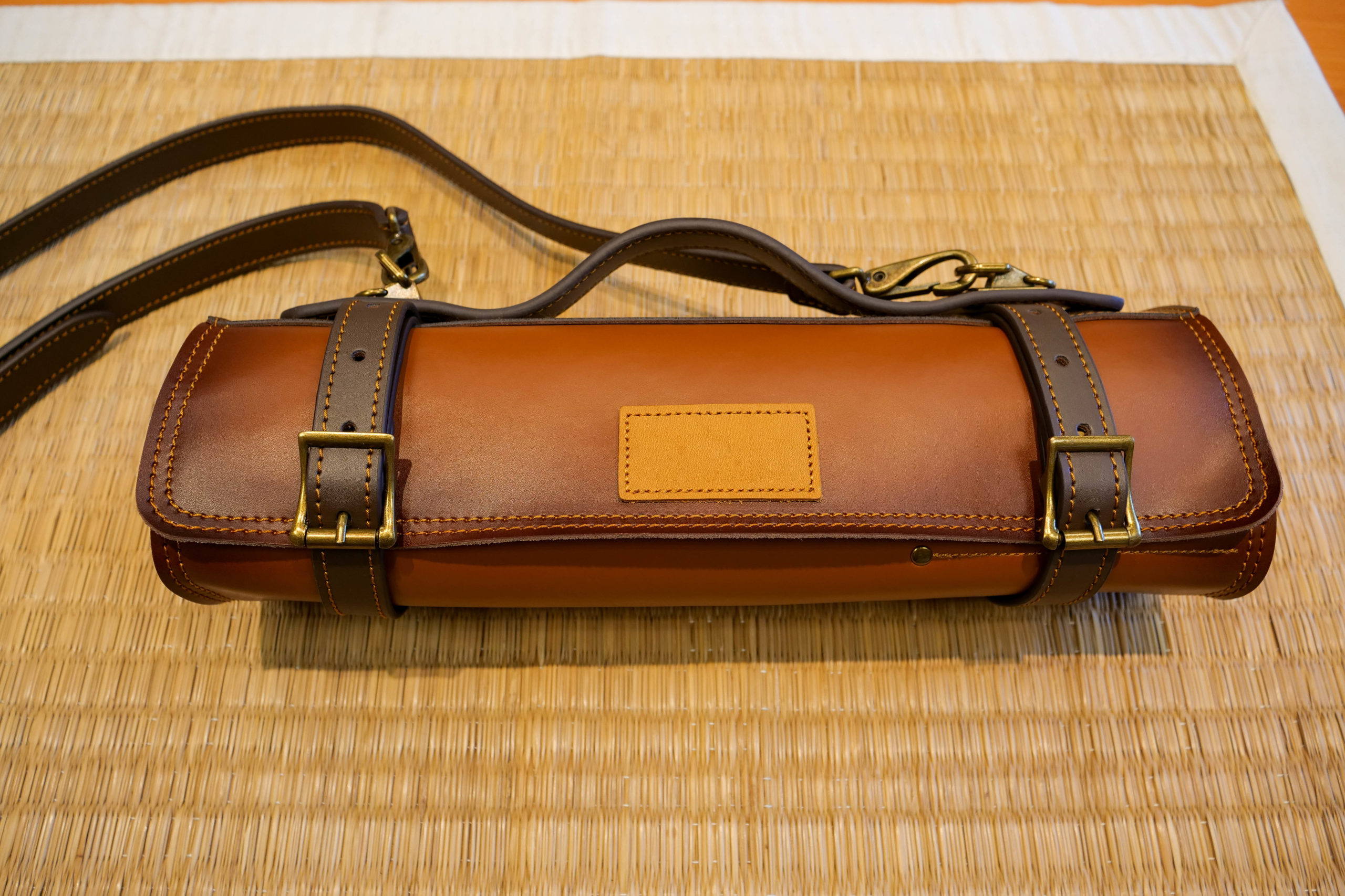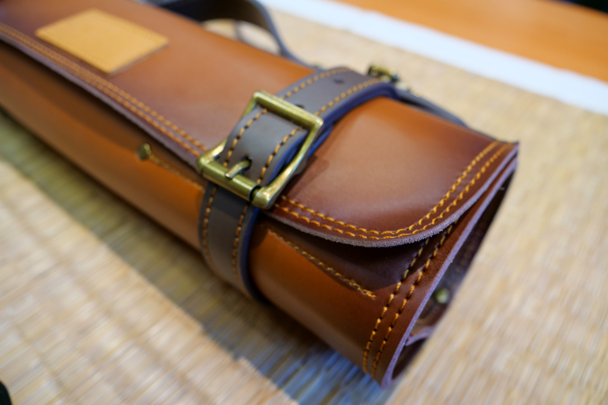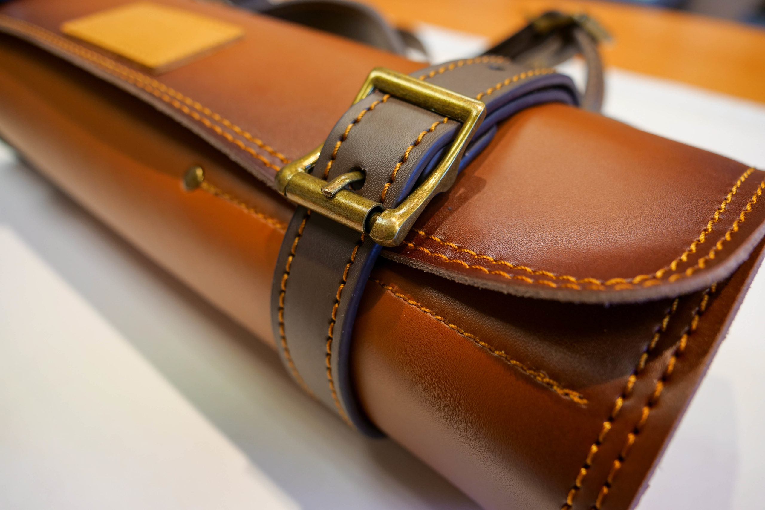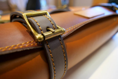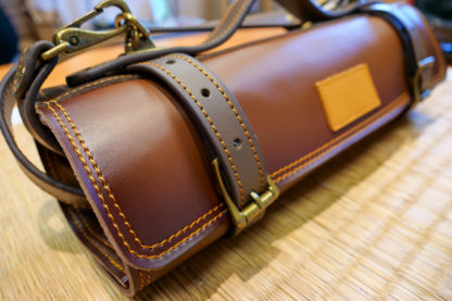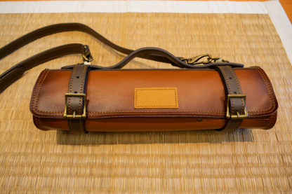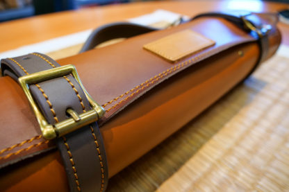 Équipé d’une fermeture ceinture deux emplacements pour plus de stabilité et de sécurité. L’étui s’enroule sur lui-même jusqu’à atteindre l’épaisseur prévue équipée. Il est également muni d’une poignée semi-rigide en cuir ainsi qu’une bandoulière en cuir réglable. Cette dernière peut être retirée facilement grâce à ses mousquetons de sécurité.