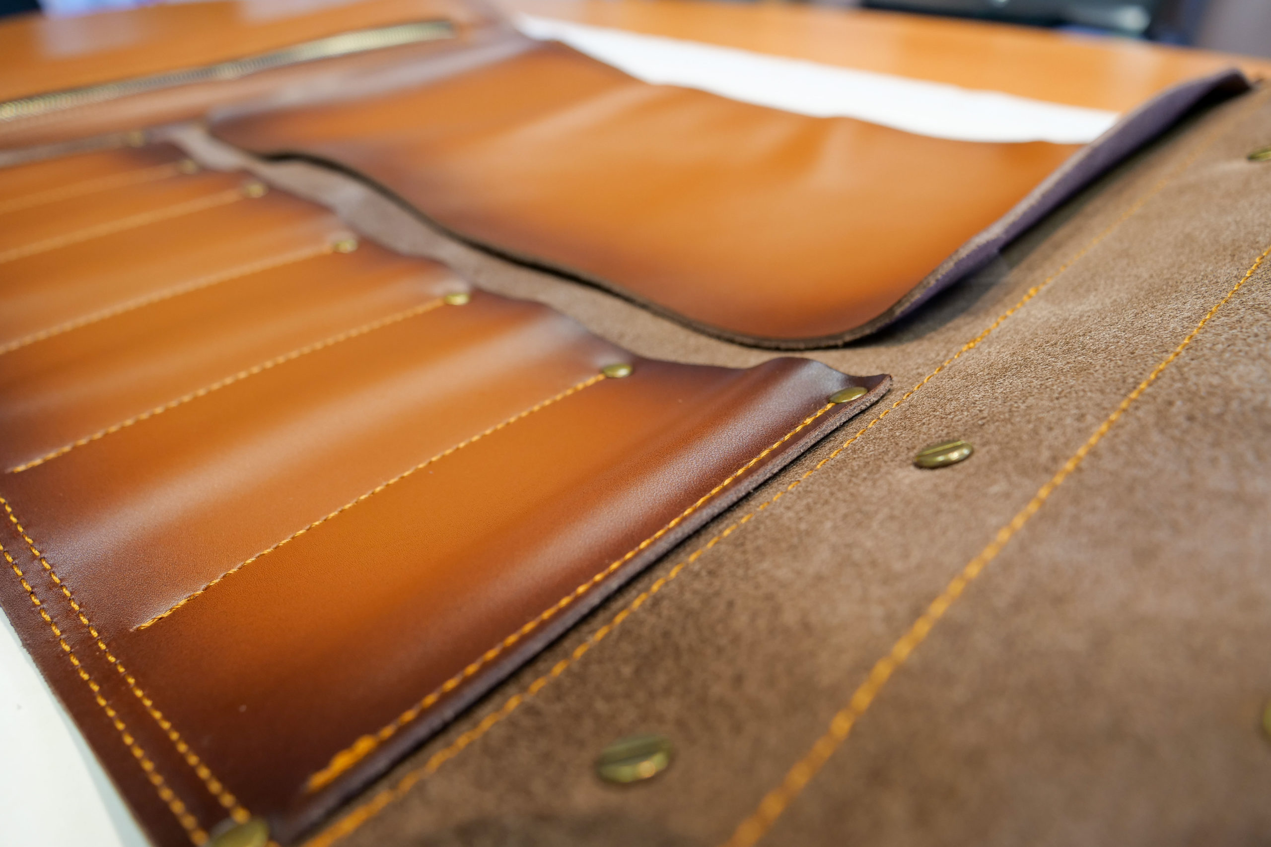 Destinée aux professionnels des métiers de bouche, cette mallette couteaux en cuir 100%, couleur brun clair. Etui 6 emplacements pour couteaux japonais et/ou européens allant jusqu’à 24 cm de longueur de lame et 12 cm de longueur de manche pour une longueur totale maximale de 36 cm. Pour un rangement simple et efficace, rentrez délicatement les lames dans les poches de protection en cuir et recouvrez les manches de vos lames de la nappe en cuir. L’étui est également équipé d’une pochette de rangement à tirette de 30 cm pour les accessoires tels qu’une râpe fine, des ciseaux de cuisine, un coupe-herbe ou encore un thermomètre de cuisson.