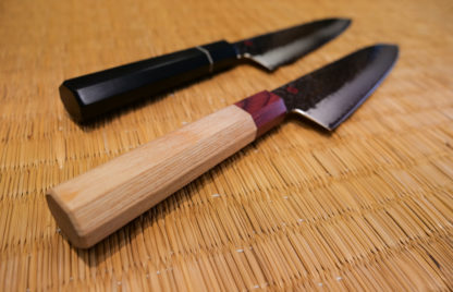 Kasumi Kuro est la fusion de plusieurs techniques à commencer par un noyau central revêtu de 32 couches (32 paires et 32 impaires) sur sa moitié inférieure et d’un martelage haute-fréquence en partie haute. C’est aussi la fusion d’influences puisées dans le passé (manche classique japonais octogonal) et de couleurs actuelles pour seoir aux cuisines actuelles. Kasumi Kuro est un concept unique dans la coutellerie japonaise de choix par la couleur.