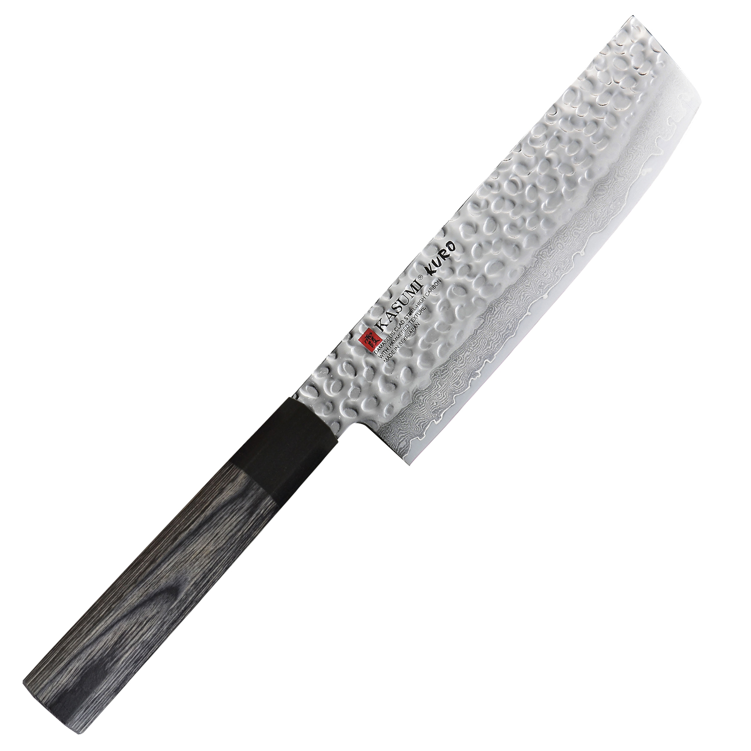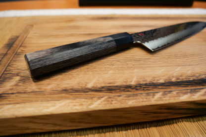 Kasumi Kuro est la fusion de plusieurs techniques à commencer par un noyau central revêtu de 32 couches (32 paires et 32 impaires) sur sa moitié inférieure et d’un martelage haute-fréquence en partie haute. C’est aussi la fusion d’influences puisées dans le passé (manche classique japonais octogonal) et de couleurs actuelles pour seoir aux cuisines actuelles. Kasumi Kuro est un concept unique dans la coutellerie japonaise de choix par la couleur.