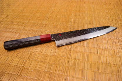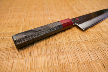 Kasumi Kuro est la fusion de plusieurs techniques à commencer par un noyau central revêtu de 32 couches (32 paires et 32 impaires) sur sa moitié inférieure et d’un martelage haute-fréquence en partie haute. C’est aussi la fusion d’influences puisées dans le passé (manche classique japonais octogonal) et de couleurs actuelles pour seoir aux cuisines actuelles. Kasumi Kuro est un concept unique dans la coutellerie japonaise de choix par la couleur.