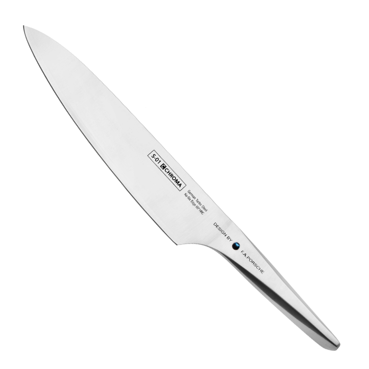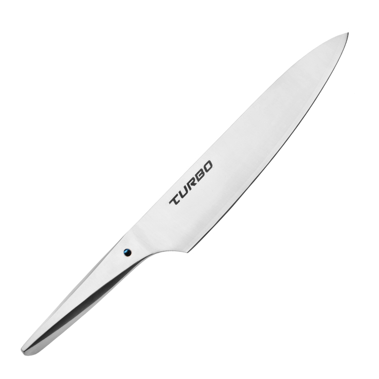 La gamme Turbo est l’upgrade de la gamme Type301 avec le passage sur un acier allemand chauffé à haute température pour atteindre les 60° Rockwell, une première dans l’industrie de l’acier européen permettant une performance de coupe des aciers japonais à 60°HRC et apportant une plus grande souplesse à l’acier qui absorbe mieux les chocs et ondes de vibrations. La gamme Turbo s’habille d’une perle bleu comme bille sensorielle pour se différencier de la gamme éponyme de la marque CHROMA. Un design intemporel qui est le seul manche métal à s’être imposé sur le marché plébiscité par la critique et les cuisiniers du monde entier.