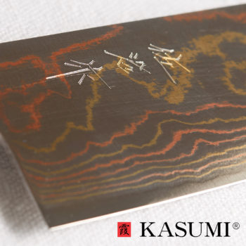 Les Kasumi Rainbow ne sont pas seulement beaux, ils sont aussi très difficiles à réaliser. Maître Saji part d’un acier d’Echizen qu’il habille ensuite de couches d’acier Copper, Gold Copper et soft stainless. On commence d’abord avec l’acier inoxydable, puis le cuivré, ensuite le doré, le stainless, le cuivré, etc… en tout nous avons 5 couches de cuivre, 4 dorées et 10 normales (pour la ductilité), ce qui fait 19 couches par côté et 38 en tout, qui sont forgées à la main pièce par pièce avant d’être martelées pour faire apparaître le dessin en damas. Nous avons assisté à la production et c’est réellement impressionnant vu que les points de fusion sont différents et que tout se fait à l’oeil nu.