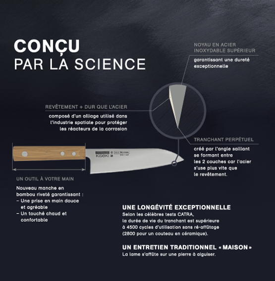 Après bien des recherches, on est tombé sur un alliage utilisé dans l’industrie spatiale pour protéger les réacteurs de la corrosion qui, combiné à un noyau en acier inoxydable en molybdène/vanadium, imite ce qui se passe chez les rongeurs, à la différence près qu’un métal ne peut pas repousser comme une dent. KISEKI s’émousse donc quand même – après un cycle d’utilisation très long – mais, et c’est le plus important, on peut toujours le ré-affûter soi-même sur une pierre à aiguiser.